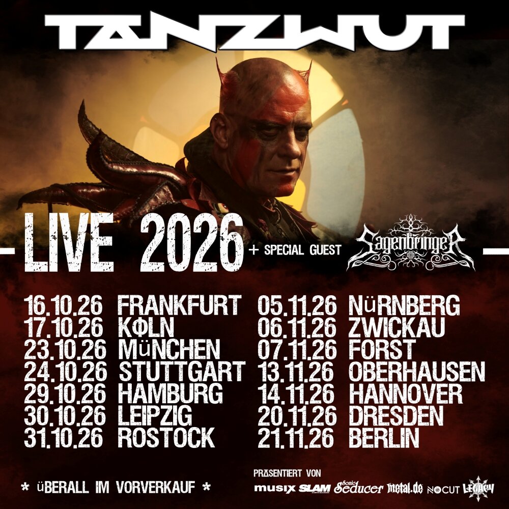TANZWUT - ACHTUNG MENSCH! Laut, kraftvoll, energiegeladen wie Donner und Blitz, mit Vollgas auf der Überholspur gehen Tanzwut im Herbst 2024 auf große Tour. ACHTUNG MENSCH! Ein Ausruf - der ins Ohr geht, der mitten ins Herz trifft. Die Musik der Berliner Band ist live überzeugender, denn je und schon längst eine feste Größe in der Rockszene. Provokant, lockend, verheißungsvoll hören wir Teufels Stimme rufen: ACHTUNG MENSCH! Neugierig geworden? Dann seid Euch gewiss, die Tanzwut kommt zu Dir!